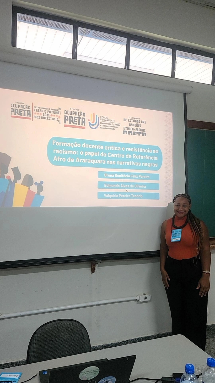 As pesquisas de Bruna fortaleceram os debates sobre equidade racial, justiça social e a formação docente crítica, evidenciando a potência das narrativas negras como ferramenta pedagógica e política, e culminou na apreciação para publicação pela Revista Ethnos Brasil, um reconhecimento significativo no cenário acadêmico. Bruna também apresentou o trabalho “Formação Docente Crítica e Resistência ao Racismo: O Papel do Centro de Referência Afro de Araraquara nas Narrativas Negras” no VII Congresso Nacional de Formação de Professores, no XVII Congresso Estadual Paulista sobre Formação de Educadores e no V Festival Ocupação Preta, que integrou o 9º Fórum Permanente de Diversidade, Equidade e Direitos Humanos e o I Congresso de Estudos das Relações Étnico-Raciais, na Unesp de Presidente Prudente.