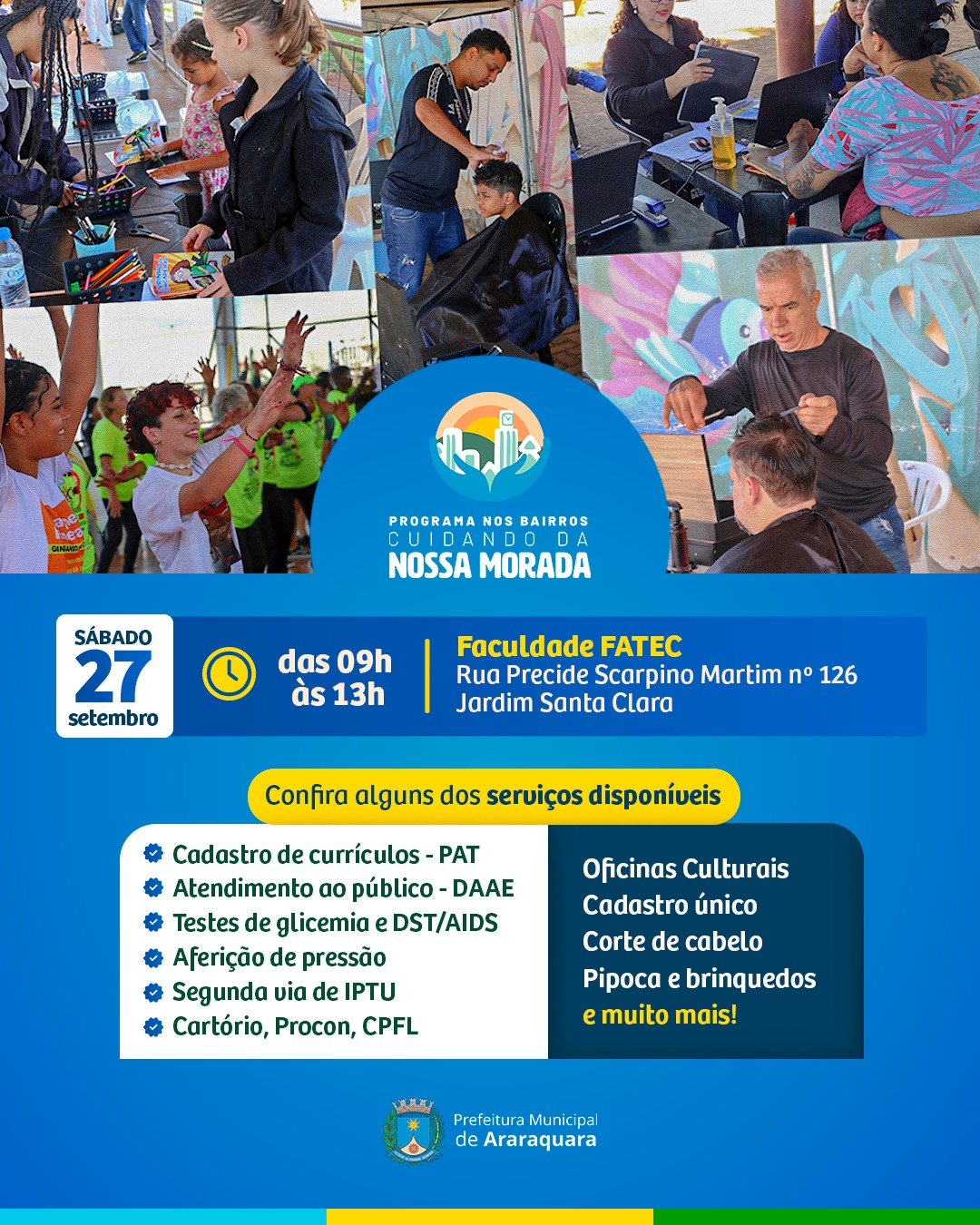 Pensando em facilitar o acesso, a Prefeitura de Araraquara leva mais uma vez seus serviços para perto da população. O Programa nos Bairros “Cuidando da Nossa Morada” acontecerá dentro da Fatec, no sábado (27), com plantão de atendimentos que vão desde cadastro de currículos e emissão de certidões até testes de saúde.