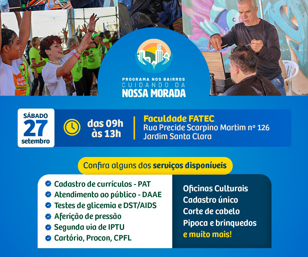 Pensando em facilitar o acesso, a Prefeitura de Araraquara leva mais uma vez seus serviços para perto da população. O Programa nos Bairros “Cuidando da Nossa Morada” acontecerá dentro da Fatec, no sábado (27), com plantão de atendimentos que vão desde cadastro de currículos e emissão de certidões até testes de saúde.