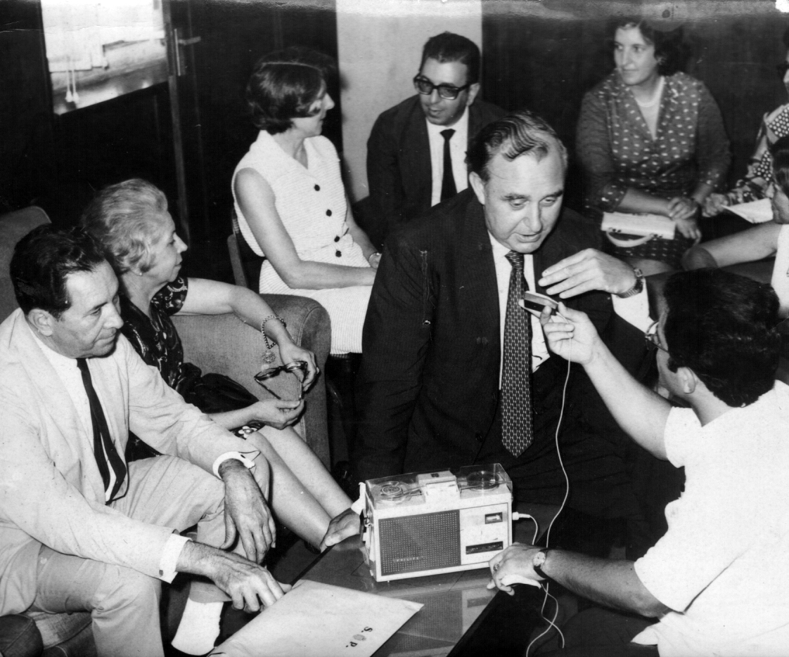 Visita do Cônsul Britânico sendo entrevista por Geraldo Polezze e ao fundo Dr. Miguel Tedde Netto e Marialice Lia Tedde, em 25 de novembro de 1969.