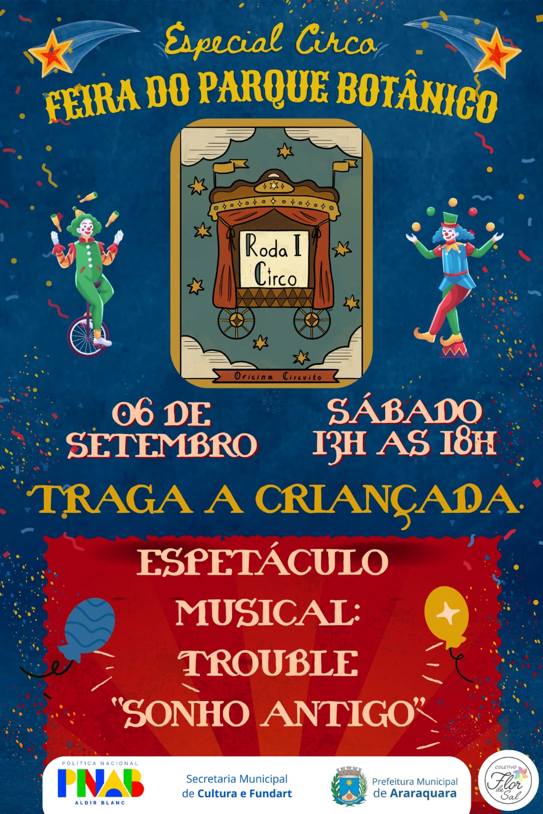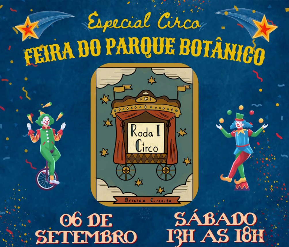 Neste sábado, 6 de setembro, tem Feira do Parque Botânico, das 13h às 18 horas com cultura, lazer e economia solidária. Nesta edição o tema “Circo” ganha destaque no Parque do Botânico com uma oficina de brincadeiras infantis, além de show musical.