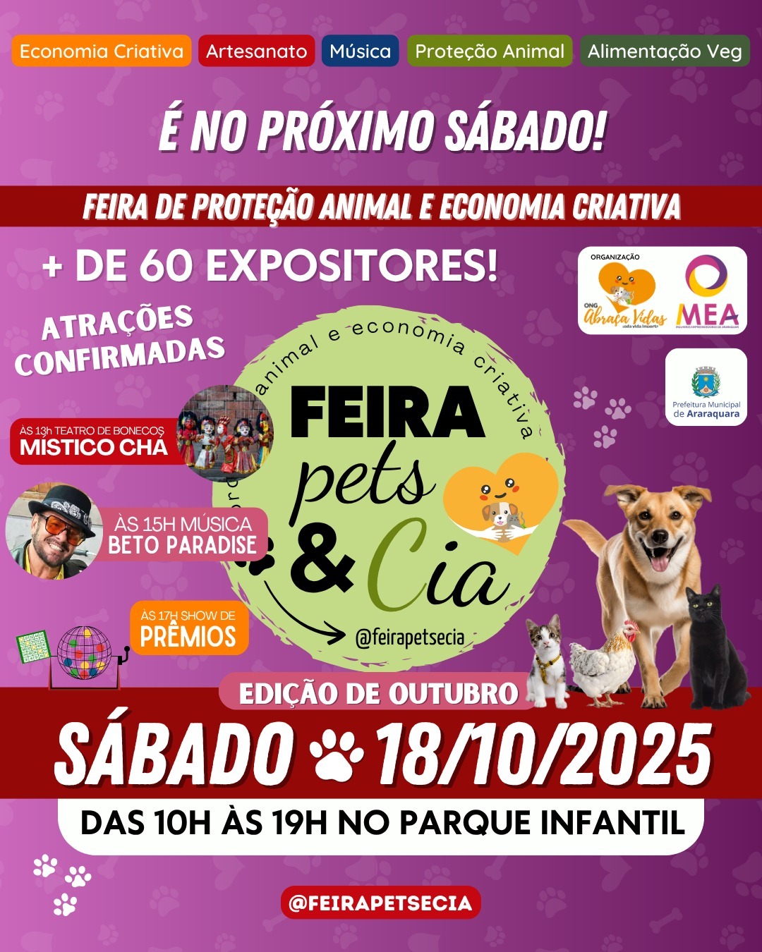 Realizada pelo Coletivo Abraça Vidas, com apoio da Prefeitura de Araraquara, por meio da Secretaria Municipal de Desenvolvimento Econômico e da Subsecretaria do Trabalho e da Economia Criativa e Solidária, a feira reúne expositores com produtos de gastronomia, bem-estar animal, além de grupos e protetores independentes dedicados à causa animal no município. Nesta edição, a programação também conta com atração musical promovida pela Secretaria Municipal da Cultura e Fundart.