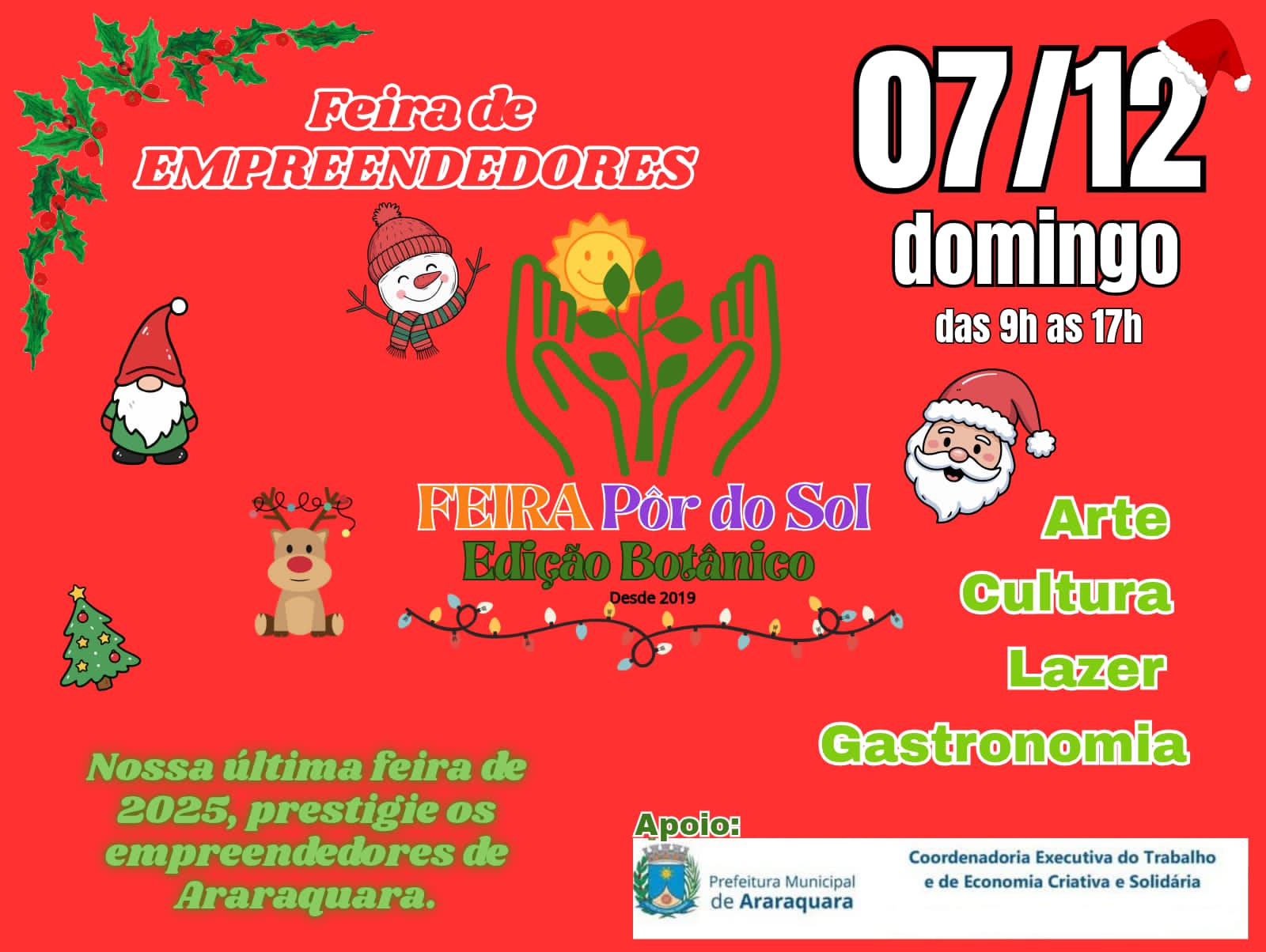 A Feira Pôr do Sol é a atração deste domingo, 7 de dezembro, na Praça do Botânico, em Araraquara. A feira acontece das 9h às 17h, com entrada gratuita e diversos expositores de Araraquara e região.