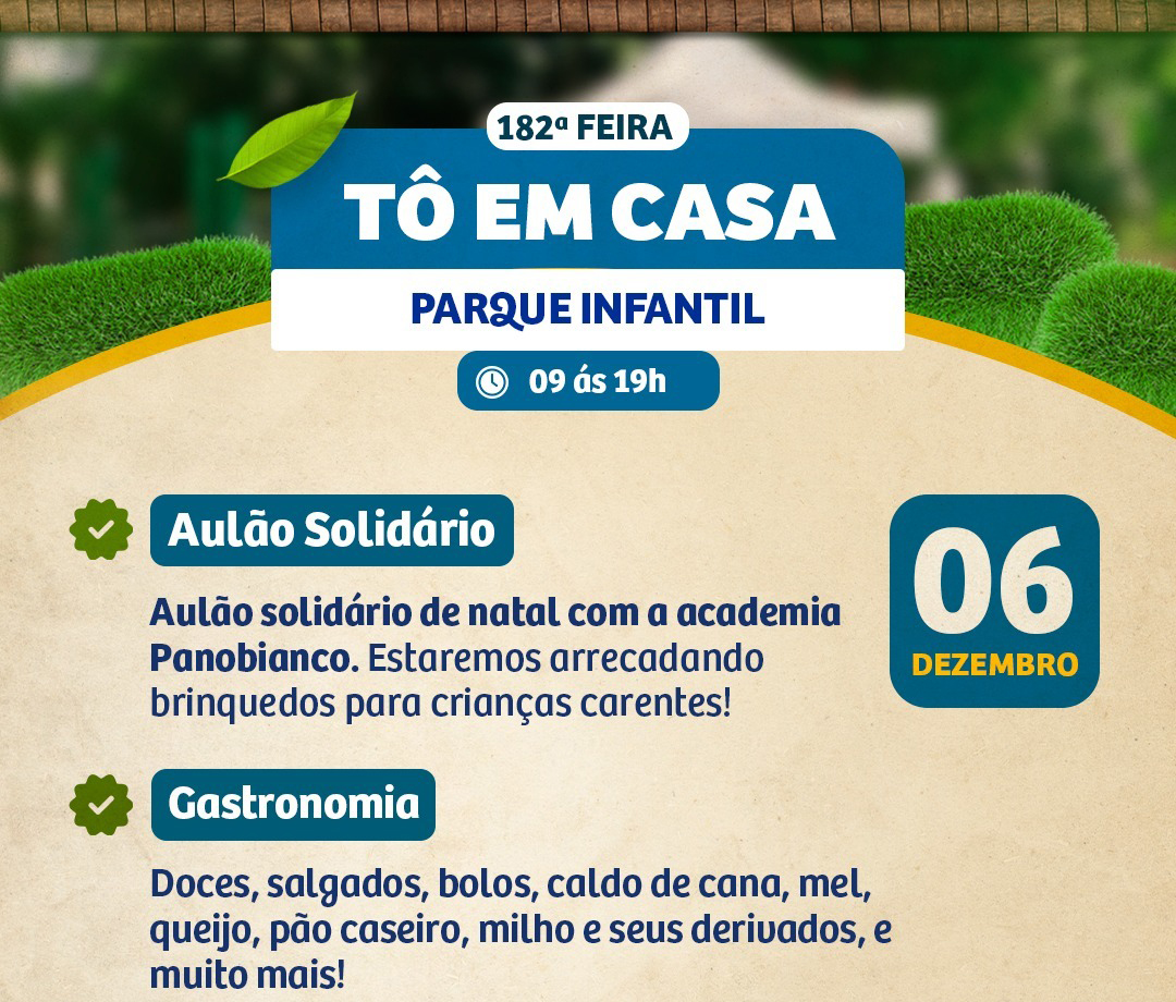 Neste sábado, 6 de dezembro, o Parque Infantil se transforma novamente em ponto de encontro para toda a família com mais uma edição da Feira “Tô em Casa”. Das 9h às 19h, o público poderá desfrutar de um dia repleto de sabores, criatividade em um ambiente gratuito e acolhedor no coração da cidade.