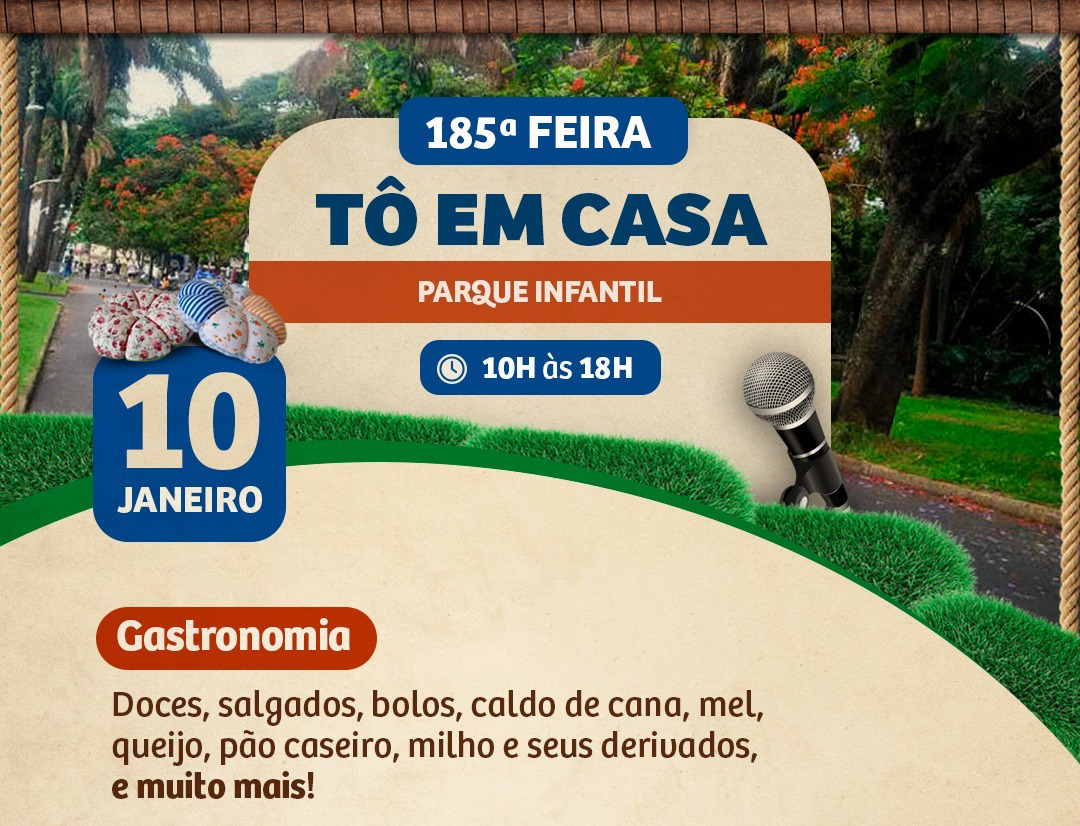 Neste sábado, 10 de janeiro, o Parque Infantil recebe mais uma edição da Feira “Tô em Casa”, das 10h às 18h, em uma realização do Coletivo Tô em Casa, com apoio da Prefeitura de Araraquara por meio da Secretaria Municipal de Desenvolvimento Econômico, via Subsecretaria do Trabalho e da Economia Criativa e Solidária.