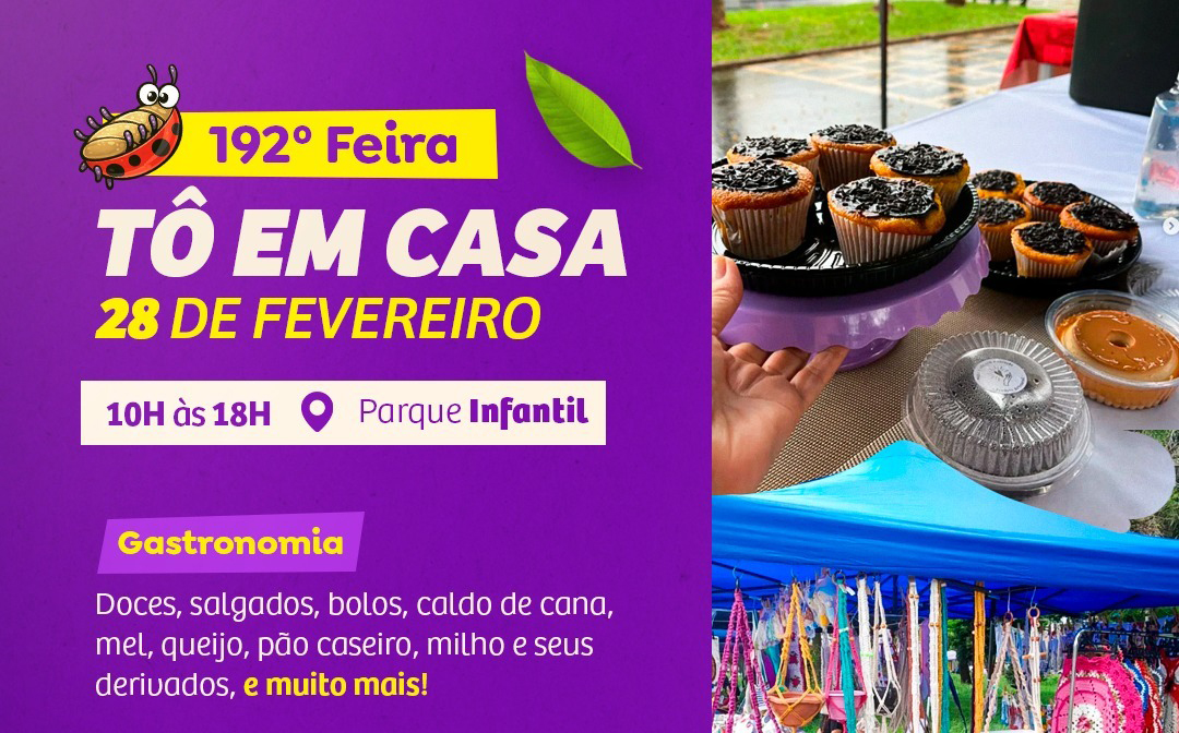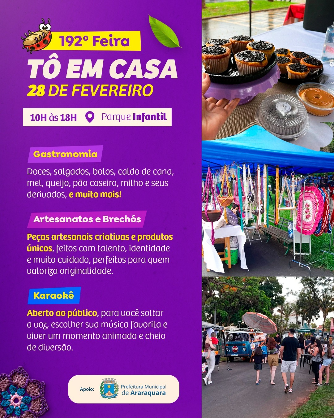 Neste sábado, 28 de fevereiro, o Parque Infantil recebe mais uma edição da Feira “Tô em Casa”, das 10h às 18h, em uma realização do Coletivo Tô em Casa, com apoio da Prefeitura de Araraquara por meio da Secretaria Municipal de Desenvolvimento Econômico, via Subsecretaria do Trabalho e da Economia Criativa e Solidária.