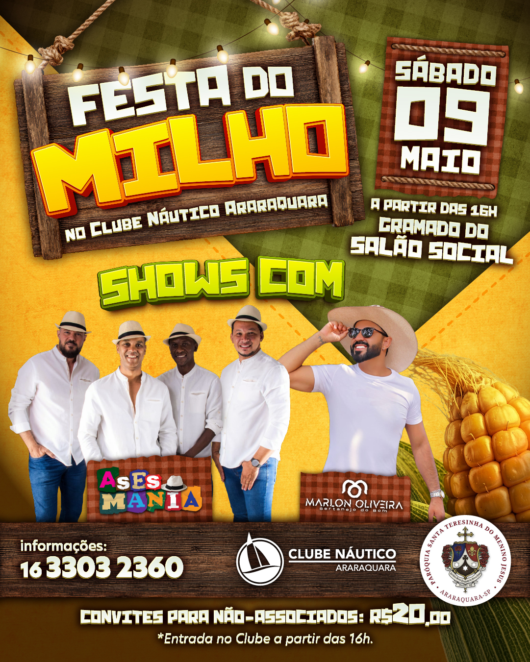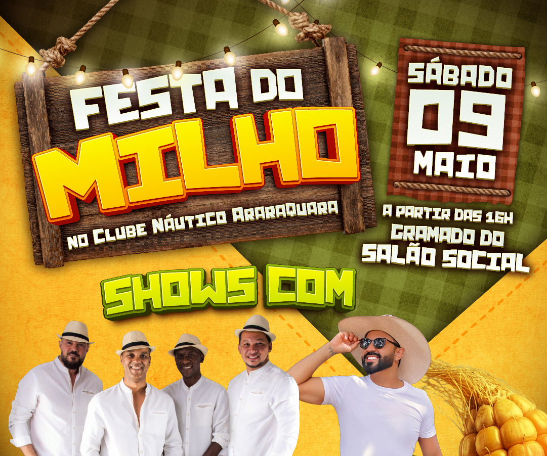 Em maio tem Festa do Milho no Clube Náutico Araraquara! Prepare-se para um dia cheio de sabor, música e diversão! Vai ser no sábado, 09 de maio, a partir das 16h, no Gramado do Salão Social.