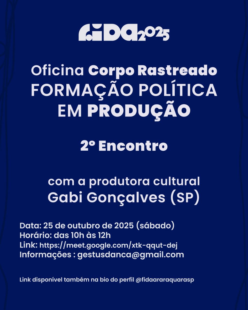 Após o sucesso da 25ª edição do Festival Internacional de Dança de Araraquara – FIDA 2025, o festival segue com sua programação formativa e realiza, no dia 25 de outubro (sábado), o 2º encontro da oficina “Corpo Rastreado – Formação Política em Produção”, conduzida pela produtora cultural Gabi Gonçalves (SP). A atividade acontece de forma on-line, das 10h às 12h, pelo link https://meet.google.com/xtk-qqut-dej.