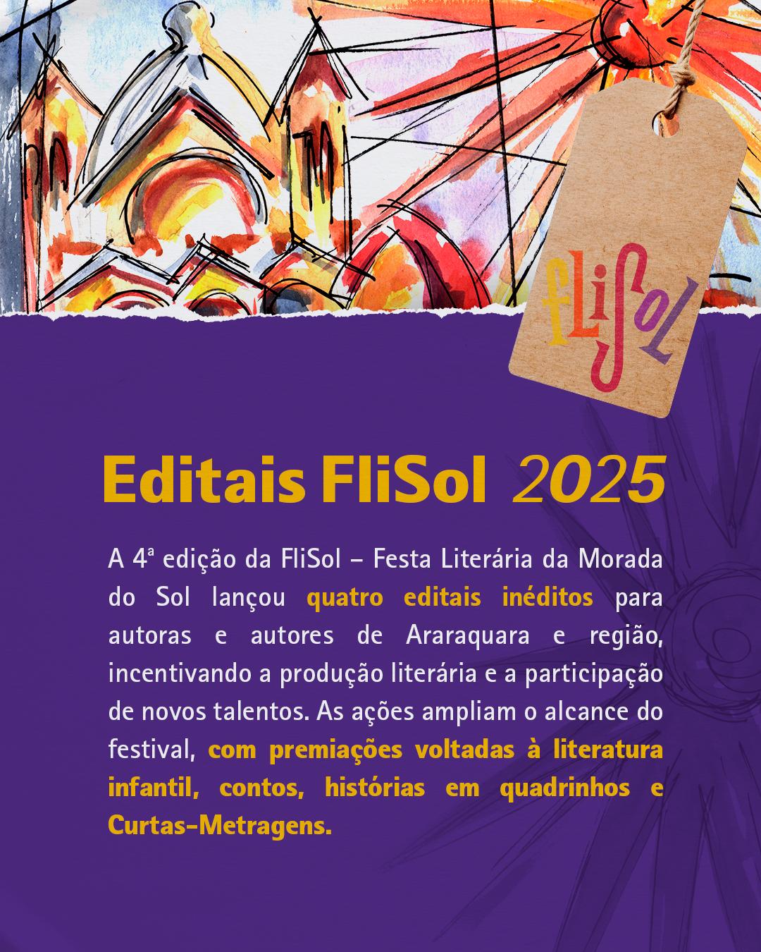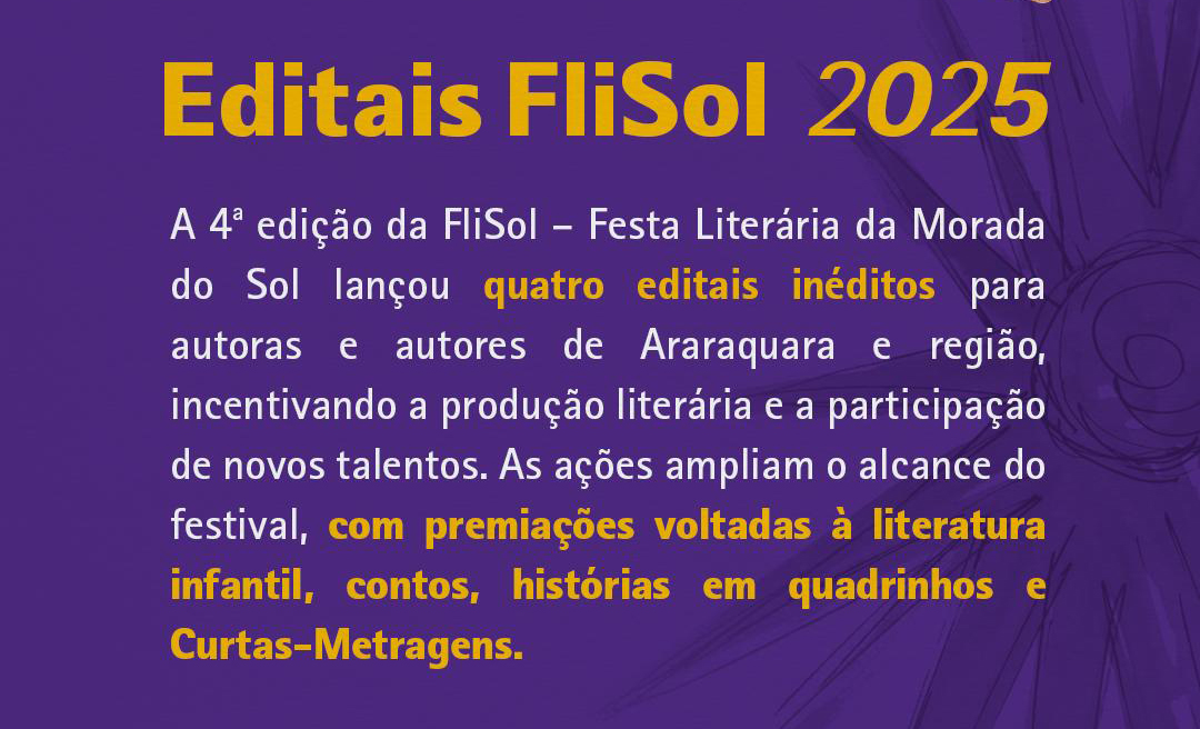 Com referência aos outros 3 editais que foram lançados em maio – obras literárias, contos adultos e HQs – as datas para inscrição foram prorrogadas. O 1º Prêmio FliSolzinha (Edital 01/2025) contempla a literatura infantil e irá selecionar duas obras inéditas: uma de autora ou autor residente em Araraquara e outra dos demais municípios da região. As obras escolhidas serão publicadas com tiragem de 100 exemplares cada, e os autores participarão da mesa de literatura infantil da FliSol, no dia 8 de novembro, às 9h, no Teatro Municipal de Araraquara. Inscrições até o dia 13 de julho.