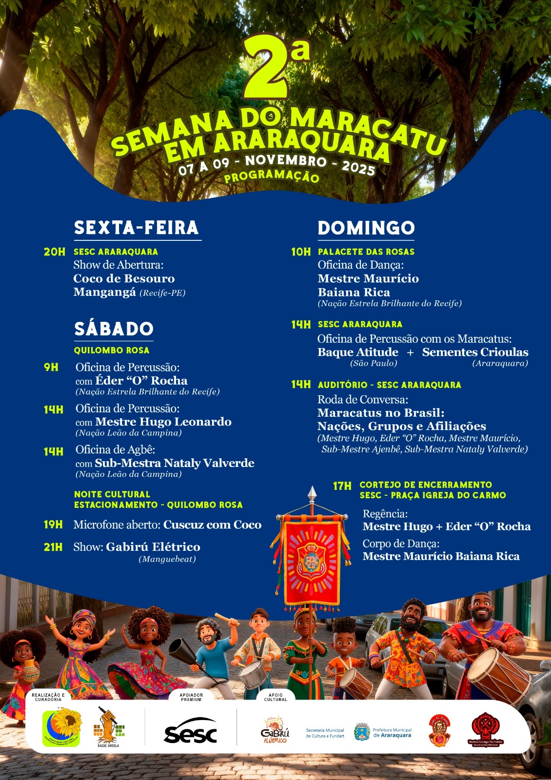 As atividades começam na sexta-feira (7), às 20h, no Sesc Araraquara, com o show de abertura “Coco de Besouro Mangangá”, grupo pernambucano de Recife que traz para o palco a força dos tambores e o canto das tradições afro-brasileiras.