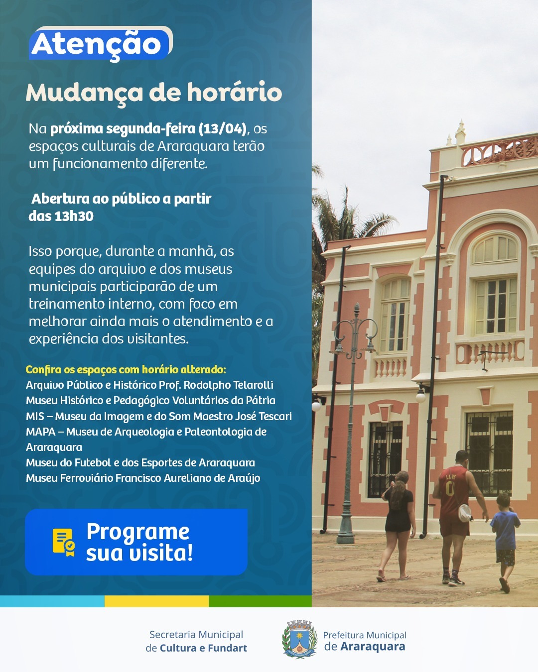 De acordo com a Secretaria Municipal de Cultura e Fundart, o horário vale para os seguintes espaços: Arquivo Público e Histórico Prof. Rodolpho Telarolli, Museu Histórico e Pedagógico Voluntários da Pátria, MIS – Museu da Imagem e do Som Maestro José Tescari, MAPA – Museu de Arqueologia e Paleontologia de Araraquara, Museu do Futebol e dos Esportes de Araraquara e Museu Ferroviário Francisco Aureliano de Araújo.
