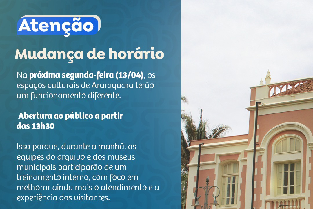 Na próxima segunda-feira, 13 de abril, os funcionários do arquivo e museus municipais passarão por treinamento pela manhã; desta forma, esses espaços terão o horário de atendimento alterado, passando o atendimento ao público para a partir das 13h30.