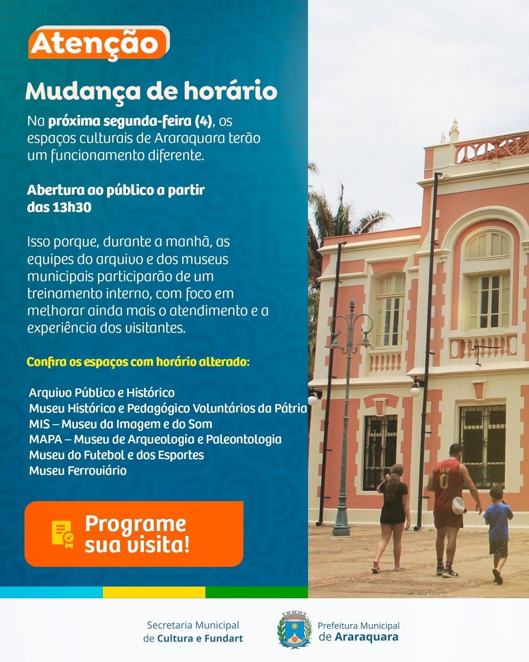 De acordo com a Secretaria Municipal de Cultura e Fundart, o horário vale para os seguintes espaços: Arquivo Público e Histórico Prof. Rodolpho Telarolli, Museu Histórico e Pedagógico Voluntários da Pátria, MIS – Museu da Imagem e do Som Maestro José Tescari, MAPA – Museu de Arqueologia e Paleontologia de Araraquara, Museu do Futebol e dos Esportes de Araraquara e Museu Ferroviário Francisco Aureliano de Araújo.