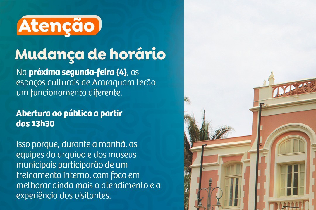 Na próxima segunda-feira, 4 de maio, os funcionários do arquivo e museus municipais passarão por treinamento pela manhã; desta forma, esses espaços terão o horário de atendimento alterado, passando o atendimento ao público para a partir das 13h30.