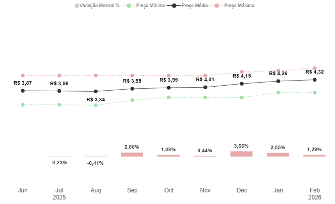 Segundo o estudo, o etanol foi o combustível que apresentou a maior alta no período, com aumento de 1,29%, passando de R$ 4,26 para R$ 4,32 por litro. Já a gasolina comum teve elevação mais moderada, de 0,25%, saindo de R$ 5,98 em janeiro para R$ 6,00 em fevereiro. No sentido oposto, o gás de cozinha (GLP) apresentou queda de 1,43%, enquanto o óleo diesel permaneceu com preço médio estável no município.