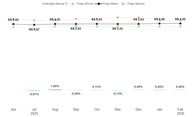 Diferentemente dos demais combustíveis, o óleo diesel manteve estabilidade em fevereiro, com preço médio de R$ 5,96, o mesmo registrado no mês anterior. Nos postos pesquisados, os valores variaram de R$ 5,75 a R$ 6,19, uma diferença de R$ 0,44, equivalente a 7,65%.