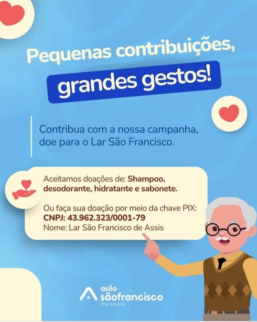 O Lar São Francisco está promovendo uma nova campanha de arrecadação de itens de higiene pessoal, como shampoo, desodorante, hidratante e sabonete.