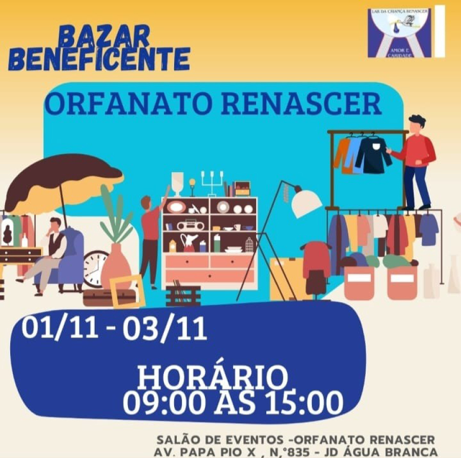 A pedido de Ricardo Caparelli, presidente do Orfanato Renascer, informamos que o próximo Bazar Solidário já está sendo preparado!