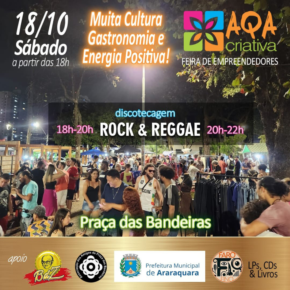 A feira de empreendedores AQA Criativa é atração gratuita neste sábado, dia 18 de outubro, na Praça das Bandeiras, das 18h às 22h, em uma realização do coletivo AQA Criativa, com apoio da Secretaria Municipal de Desenvolvimento Econômico, via Subsecretaria do Trabalho e da Economia Criativa e Solidária.