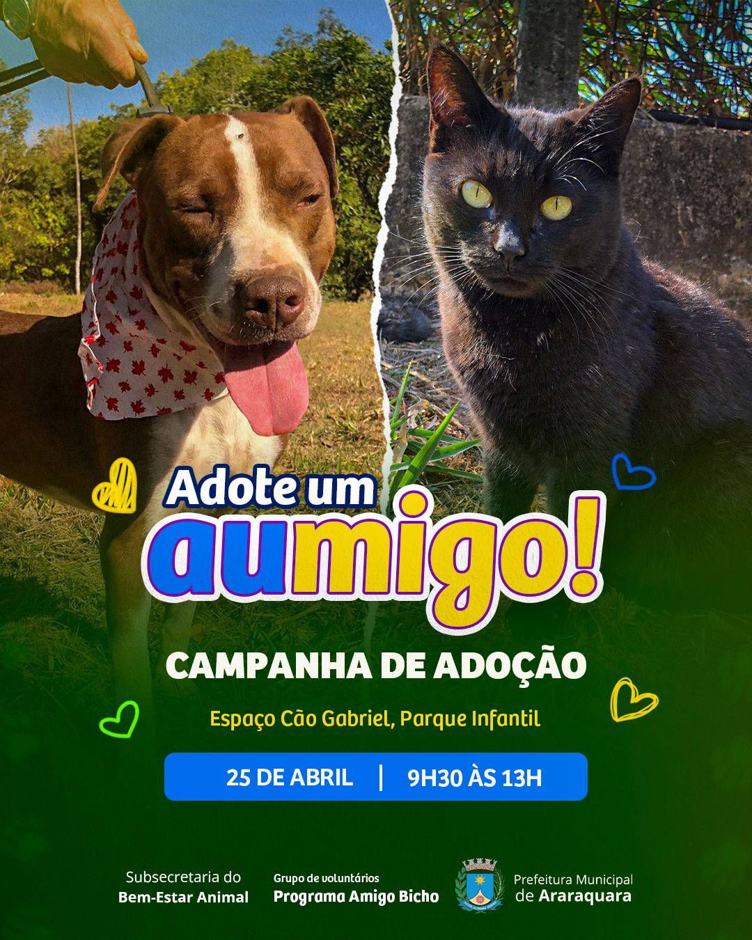 A Prefeitura de Araraquara, por meio da subsecretaria do Bem-Estar Animal, e em parceria com o grupo de voluntários Programa Amigo Bicho e com o Canil Siciliano, promove neste sábado (25), no Parque Infantil, mais uma campanha de adoção de cães e gatos. Os interessados poderão conhecer os animais no Espaço “Cão Gabriel” das 9h30 às 13h.
