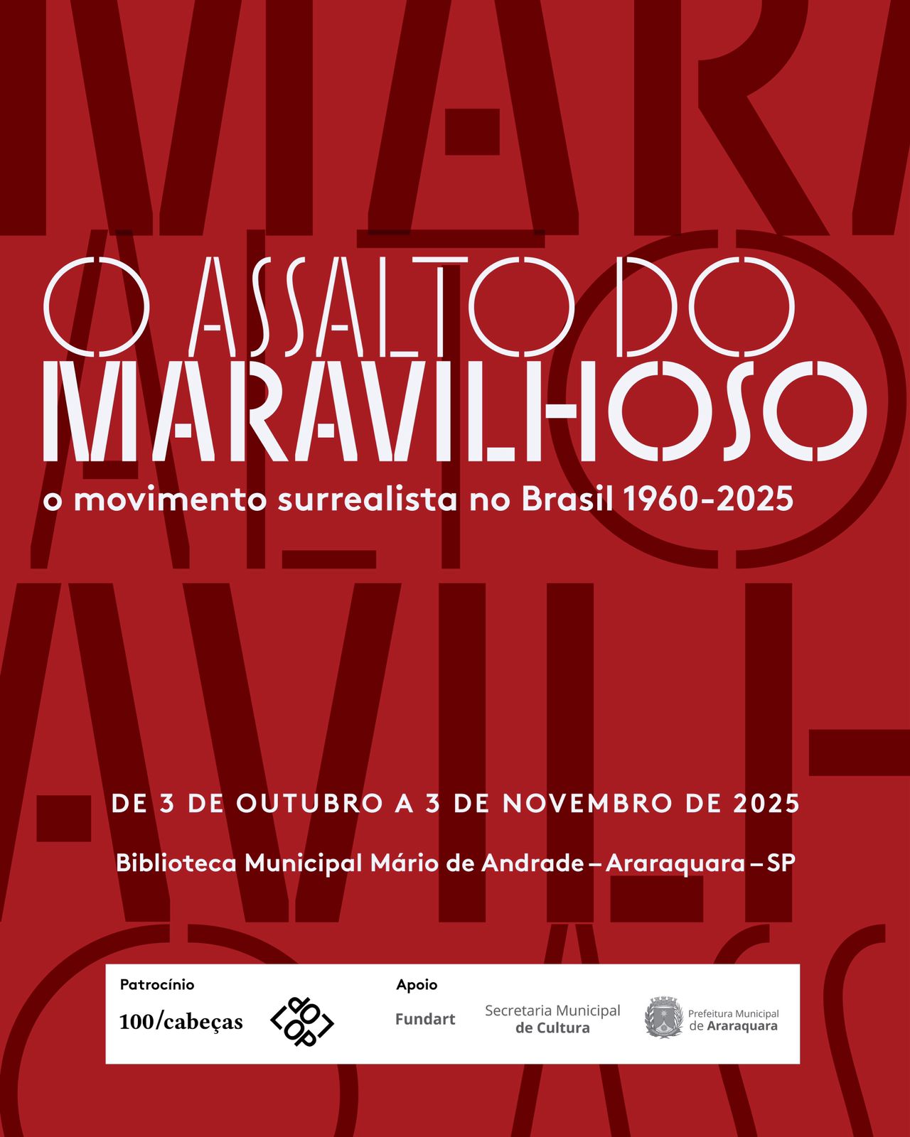“O Assalto do Maravilhoso – o movimento surrealista no Brasil 1960-2025” segue até 03 de novembro, com visitação gratuita, no horário 8h15 às 18h55. A Biblioteca Municipal Mário de Andrade está localizada na Rua Carlos Gomes, 1729, na região central de Araraquara.