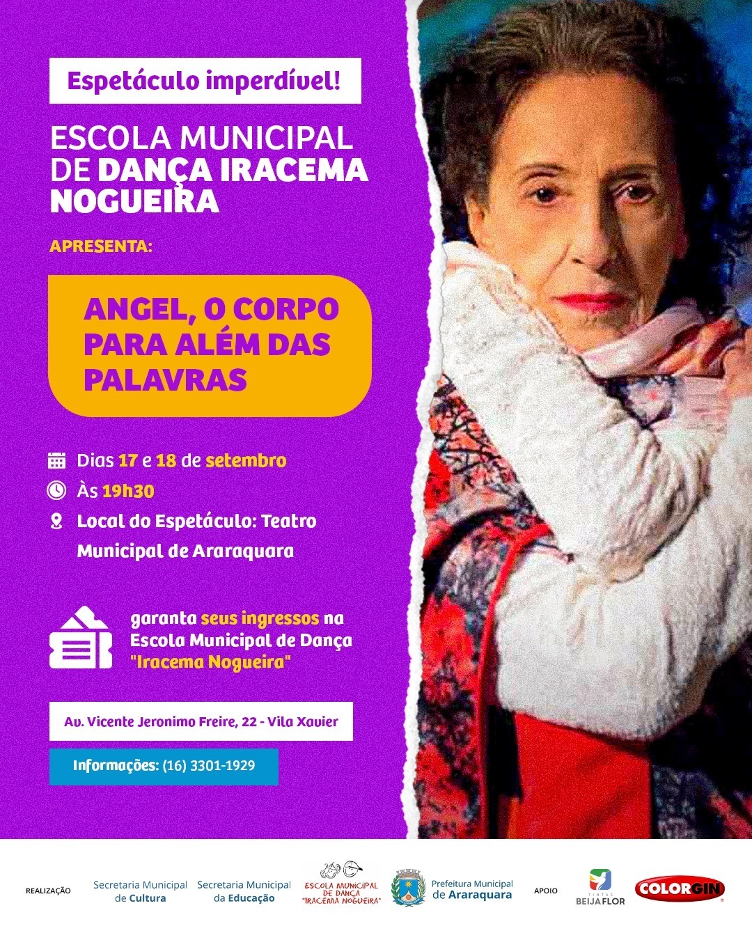 A Escola Municipal de Dança Iracema Nogueira apresenta nesta semana, na quarta e quinta-feira (dias 17 e 18), o novo espetáculo “Angel, o corpo para além das palavras”, às 19h30. Os espetáculos estão à venda por R$ 10 e podem ser adquiridos na própria escola.