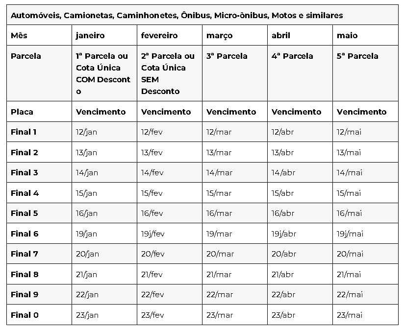 O pagamento segue o final da placa do veículo e pode ser feito à vista, com desconto de 3%, ou parcelado em até 5 vezes, de acordo com o valor do imposto devido.