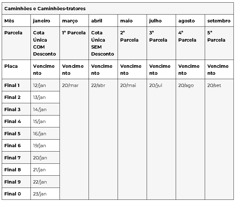 A tabela de pagamento para proprietários de veículos de carga é diferente. O pagamento pode ser feito, sem desconto, até 22 de abril, ou parcelado em até cinco vezes, com data fixada no dia 20 de cada mês.
