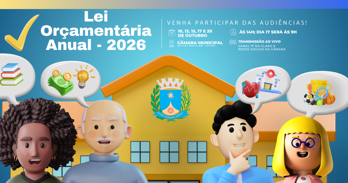 As Audiências Públicas para discussão da Lei Orçamentária Anual (LOA) 2026, que estima a receita e fixa a despesa do Município para o próximo ano, começam nesta sexta-feira (10), a partir das 14 horas, no Plenário da Casa de Leis. Ao todo, estão previstas cinco datas para apresentações dos orçamentos de todas as secretarias municipais, da Fundação de Amparo ao Esporte (Fundesport), Fundação de Arte e Cultura (Fundart), Departamento Autônomo de Água e Esgotos (Daae) e da Câmara.