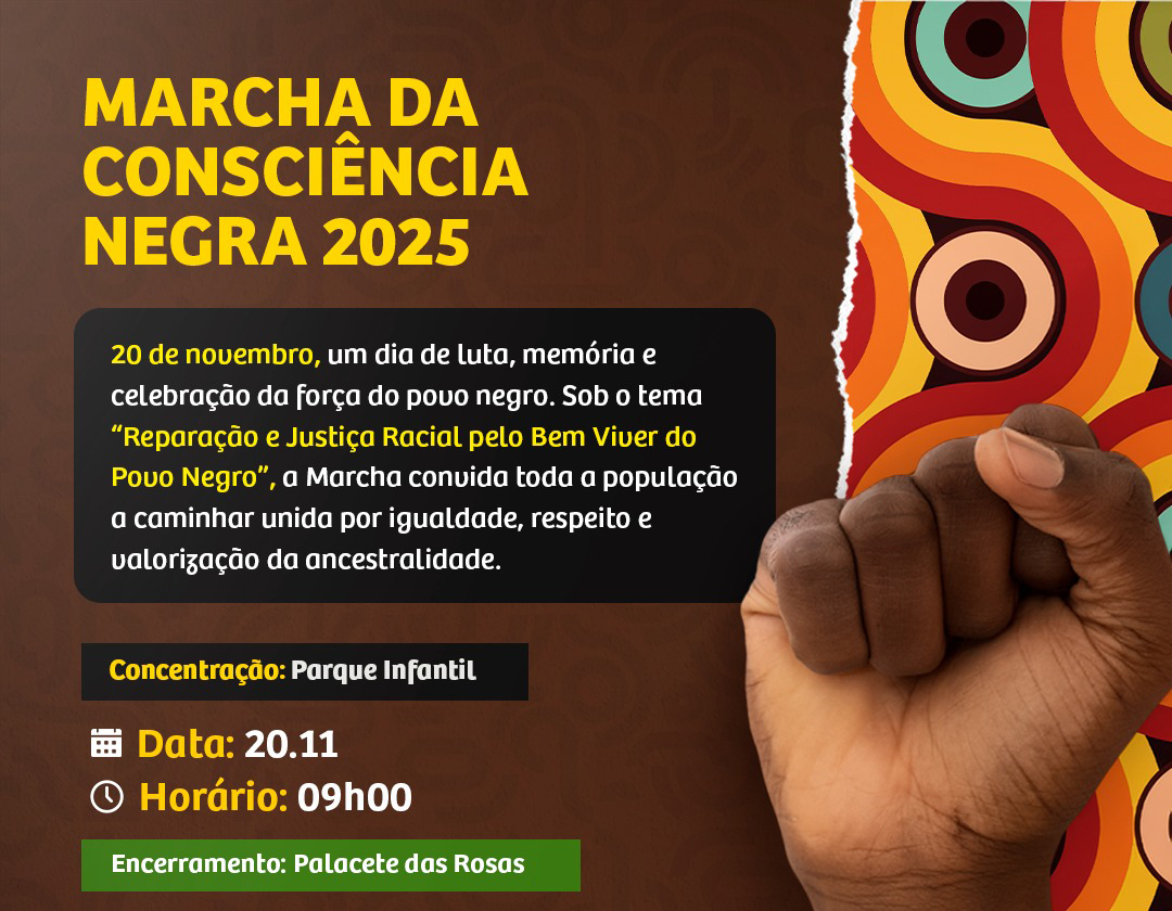 A Marcha, uma das atividades que integram a programação do Novembro Negro, tem como objetivo despertar a reflexão e conscientizar a população sobre a luta por igualdade, respeito, representatividade e justiça social.