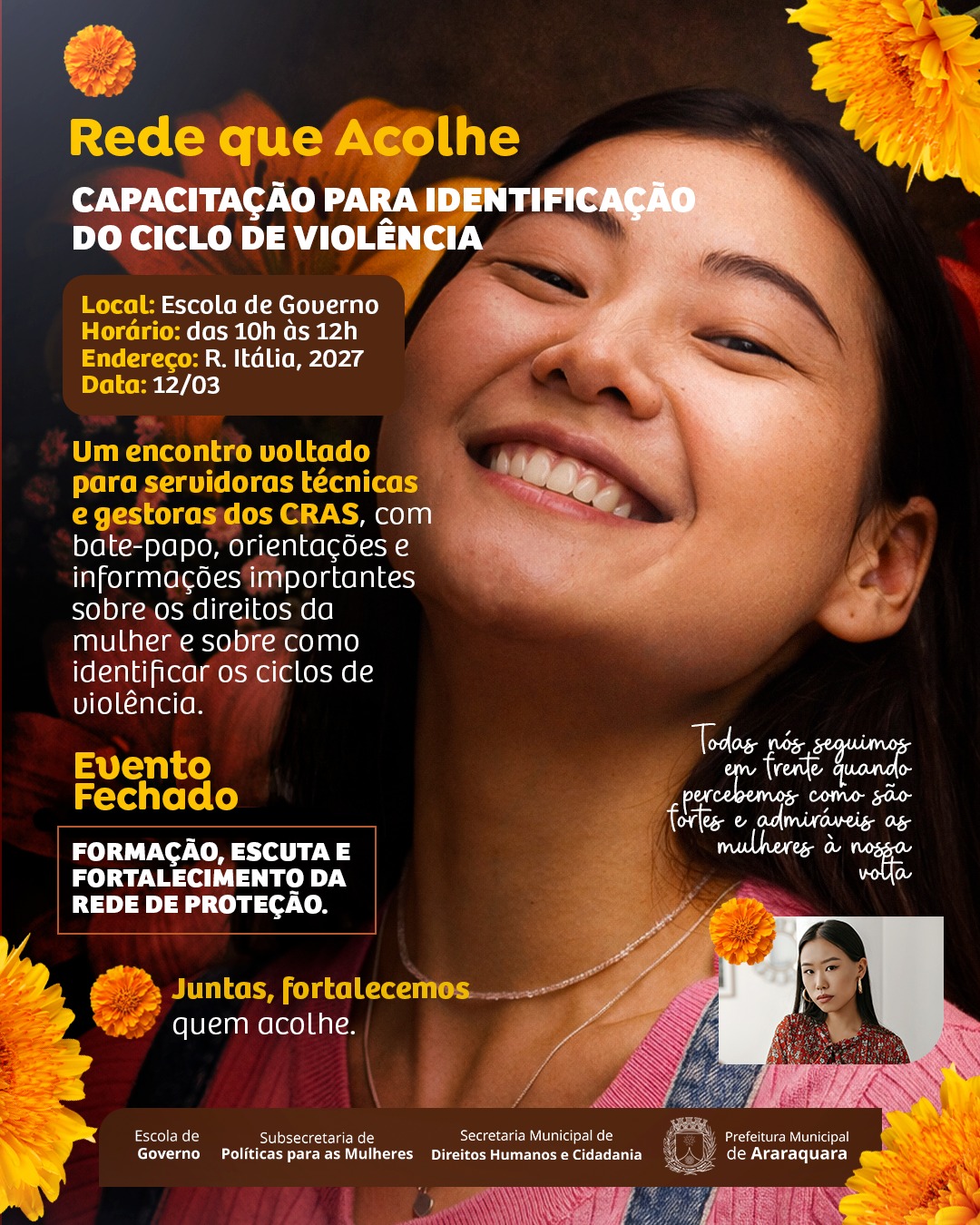 A prefeitura de Araraquara, por meio da subsecretaria de Políticas para Mulheres da Secretaria Municipal de Direitos Humanos e Cidadania, promove uma série de eventos ao longo do mês de março, o mês da mulher. As atividades têm como propósito trabalhar o ciclo da violência doméstica em suas diferentes abordagens, promovendo ações de enfrentamento e prevenção.