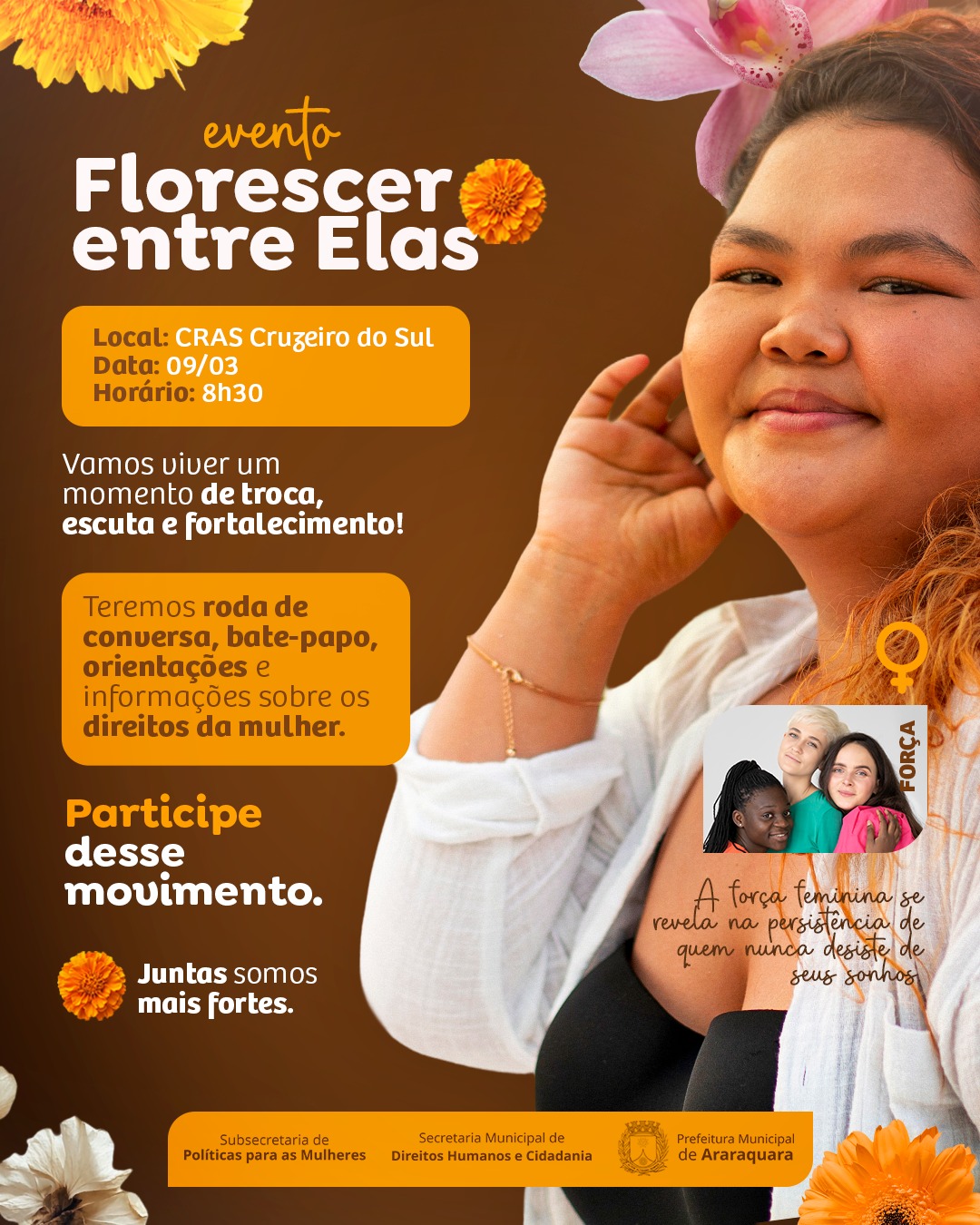 As rodas de conversa “Florescer Entre Elas” acontecem em várias unidades dos CRAS e são abertas à comunidade. Já no sábado (7), véspera do Dia Internacional da Mulher, haverá a ação “Florescer o Respeito” na Praça Santa Cruz, trazendo orientações e atendimentos para as mulheres e também para PcD, idosos e imigrantes, incluindo serviços como atualização do CadÚnico/Bolsa Família, cadastro habitacional, inscrições para oficinas culturais, entre outros.
