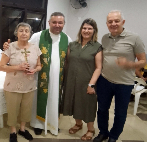 Sra. Natividade (M. Toulouse), Pe. Cristian e Casal Ana Cláudia e Eraldo (Central Park). Passagem da Cruz Missionária.