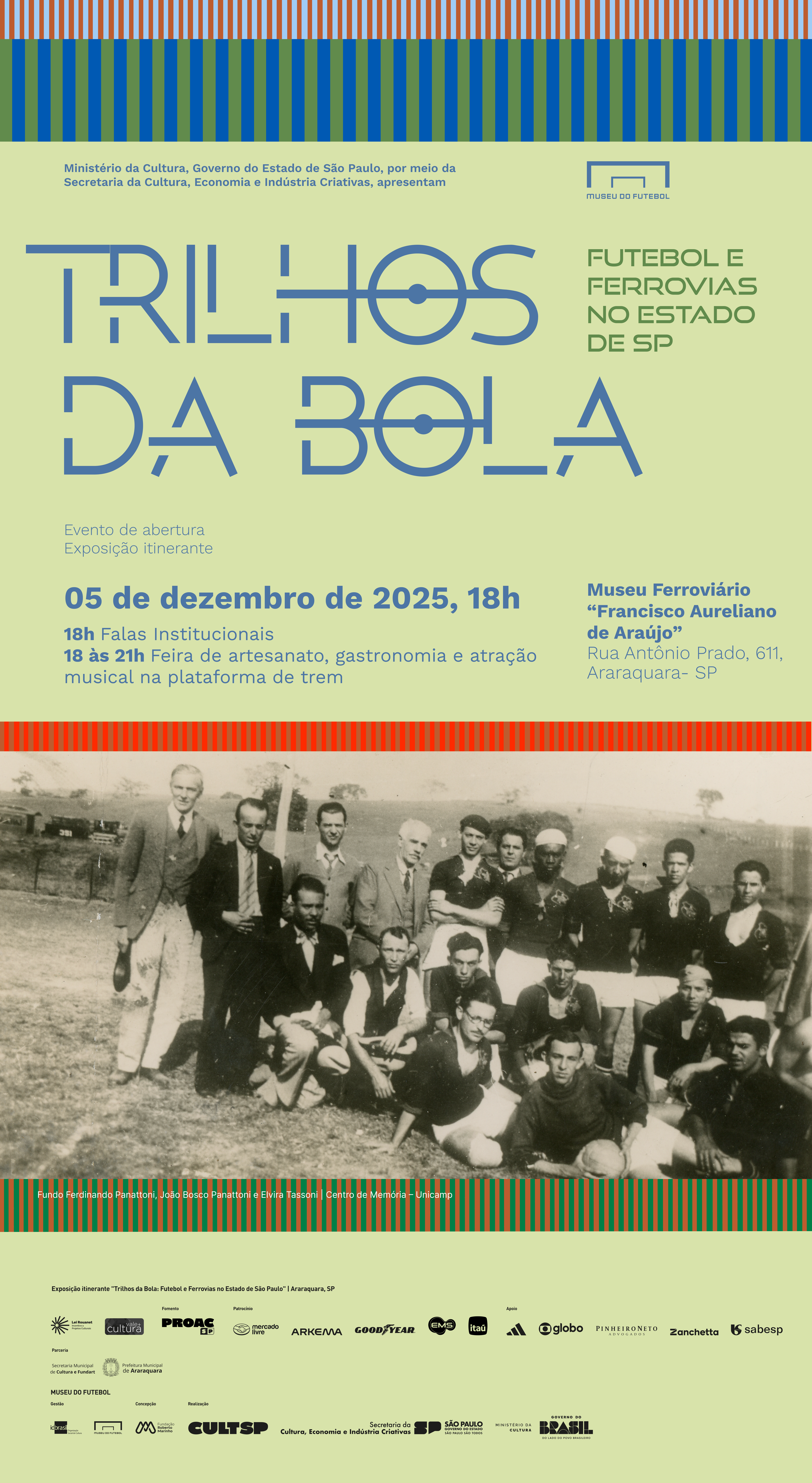 Entre os trilhos do trem e os cafezais que cobriram o interior paulista, forjou-se a paisagem que daria forma ao Estado de São Paulo. No vai e vem das locomotivas, que levavam e traziam imigrantes e grãos, chegaram também novos sonhos e paixões – entre eles, o futebol. Aprofundando a relação entre patrimônio ferroviário e a consolidação do esporte no Estado, o Museu do Futebol, instituição da Secretaria da Cultura, Economia e Indústria Criativas do Governo de São Paulo, inaugura no dia 5 de dezembro, em Araraquara, a exposição “Trilhos da Bola”. A mostra ficará em cartaz no Museu Ferroviário “Francisco Aureliano de Araújo”. A abertura oficial será às 18h com representantes da cidade, do Museu do Futebol e do Sisem-SP, além de uma feira gastronômica, de artesanato e atração musical com ritmos caipiras.