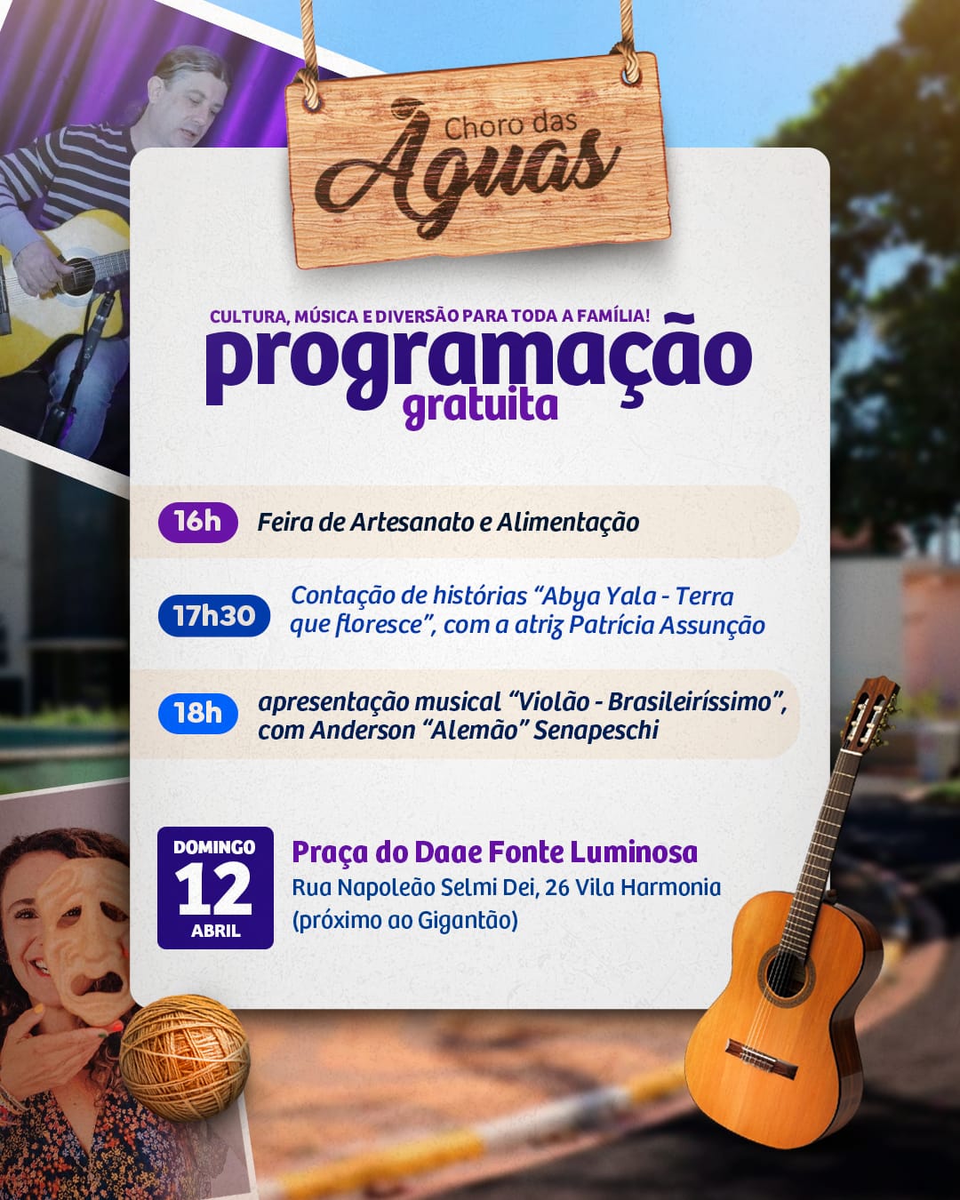 Programação gratuita tem início com feira de artesanato às 16h; contação com Patrícia Assunção é às 17h30; depois às 18h tem Anderson “Alemão” com show solo “Violão – Brasileiríssimo” e repertório de clássicos da MPB