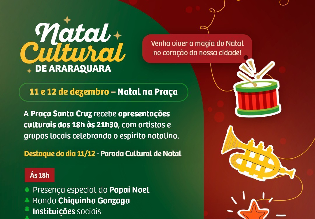 “Natal Cultural de Araraquara” conta com a programação do “Natal na Praça”, na Praça Santa Cruz (dias 11 e 12) e a “Parada Cultural de Natal”, com percurso na Rua 2 (dia 11)