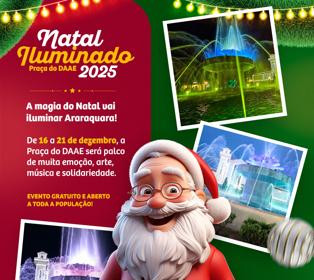 O Natal Iluminado 2025 terá seis dias de programação na Praça do Daae, entre os dias 16 e 21 de dezembro, com atrações artísticas e musicais, solidariedade e muita emoção para toda a população de Araraquara.
