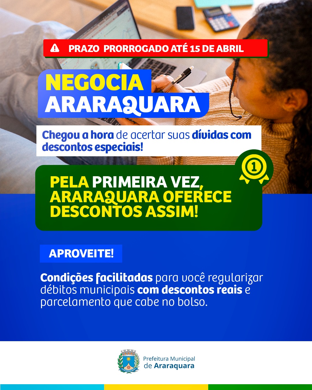 A Prefeitura de Araraquara publicou nesta segunda-feira (30) mais um edital de prorrogação de vigência do programa “Negocia Araraquara”. O novo prazo para adesão vai até o dia 15 de abril, oferecendo aos cidadãos a oportunidade de quitar débitos fiscais junto ao poder público municipal com desconto e possibilidade de parcelamento.