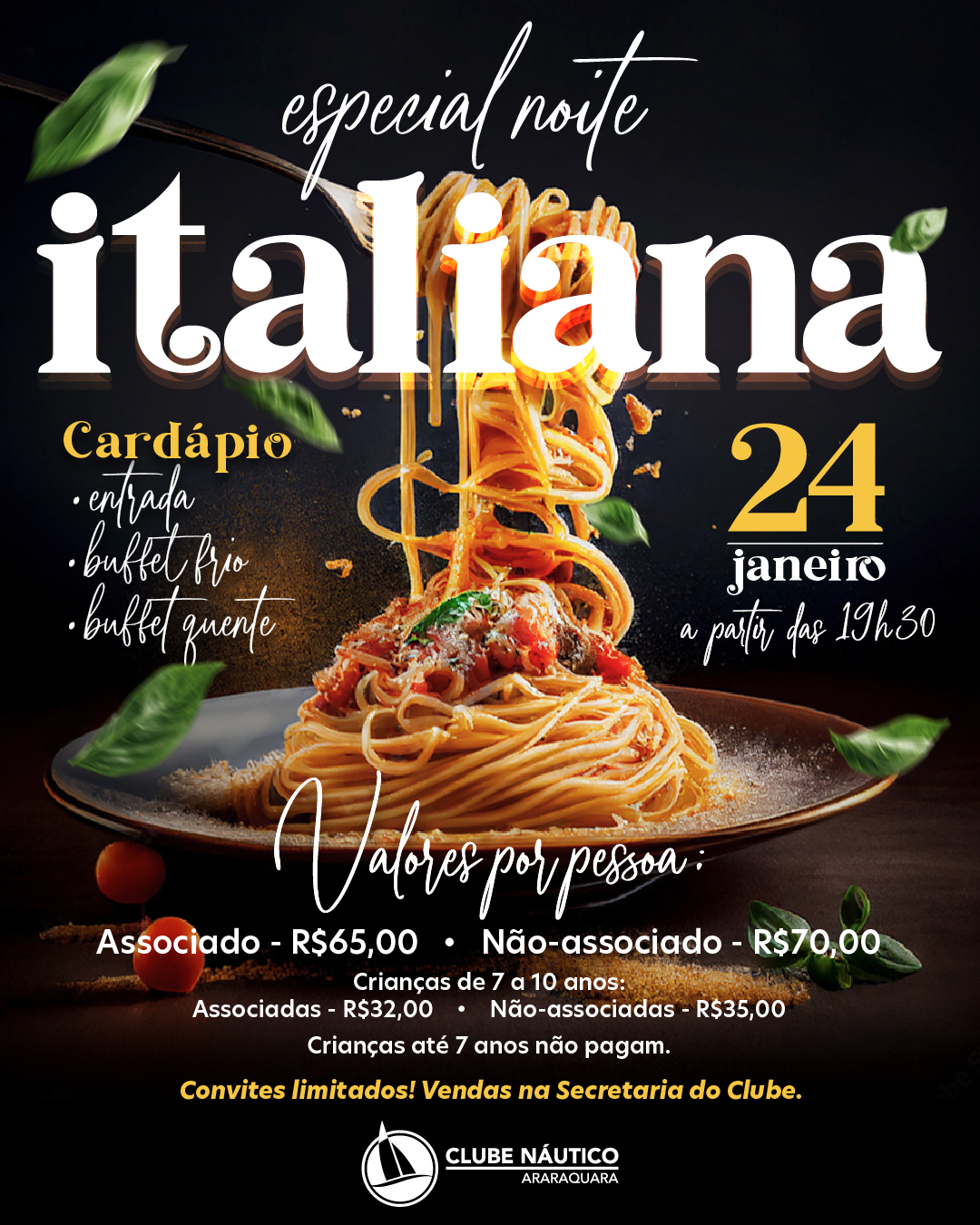 Uma noite de grandes sabores e muita diversão! Dia 24 de janeiro, o Clube Náutico Araraquara promove, em sua sede de campo, a “Noite Italiana”, evento que irá reunir associados e convidados em um ambiente marcado por boa gastronomia, música e confraternização.