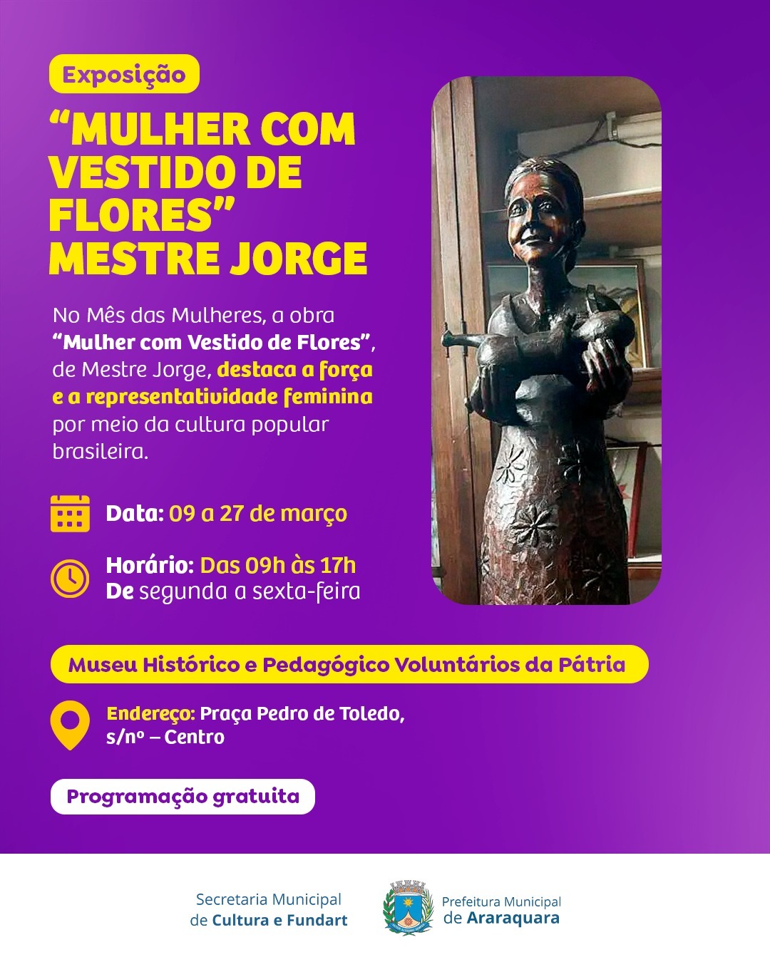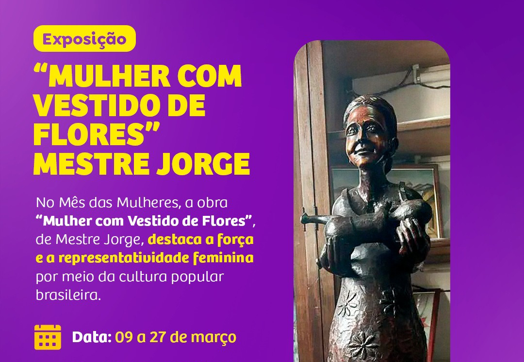 A cultura popular, por meio da obra de Mestre Jorge, é destaque em março, Mês das Mulheres, no Museu Histórico e Pedagógico Voluntários da Pátria. A Secretaria Municipal de Cultura e Fundart, em homenagem às mulheres, destacam a obra “Mulher com vestido de flores” na programação gratuita do museu.