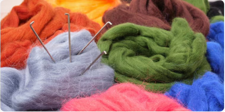 A oficina convida os participantes a experimentar a técnica têxtil da feltragem com lã em formato plano, utilizando o tecido como base para a aplicação.