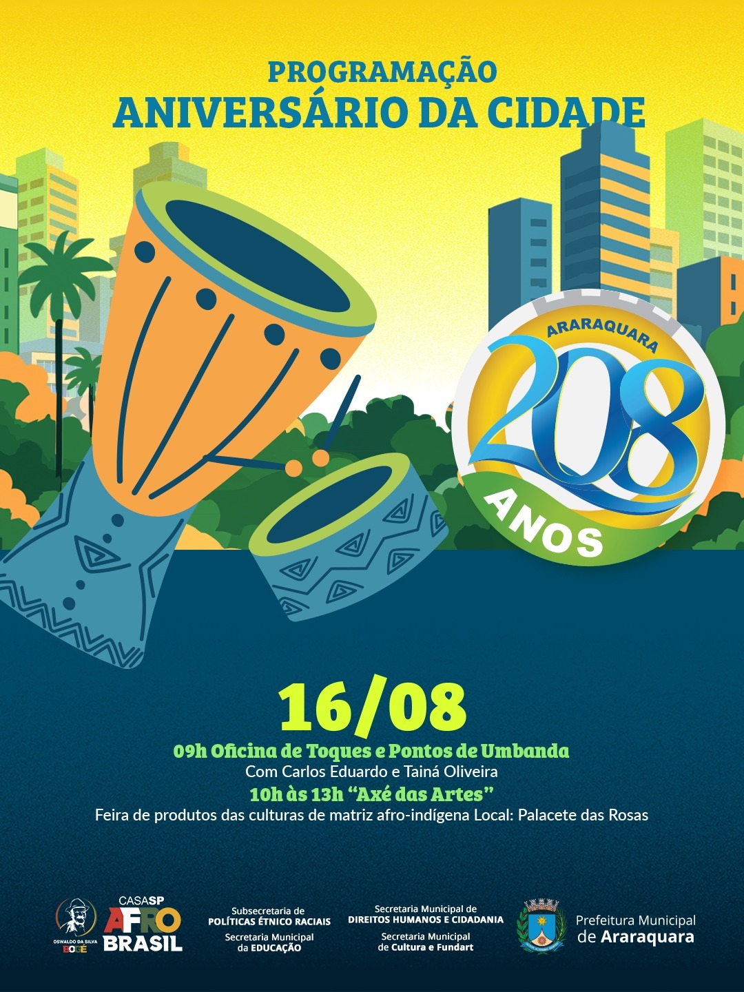 A programação gratuita do Encontro é uma realização da Secretaria Municipal de Cultura e Fundart, com apoio da Subsecretaria de Políticas Étnico-Raciais, da Secretaria Municipal da Educação e do Sesc Araraquara. O Palacete das Rosas está localizado na Rua São Bento, 794, no Centro de Araraquara.