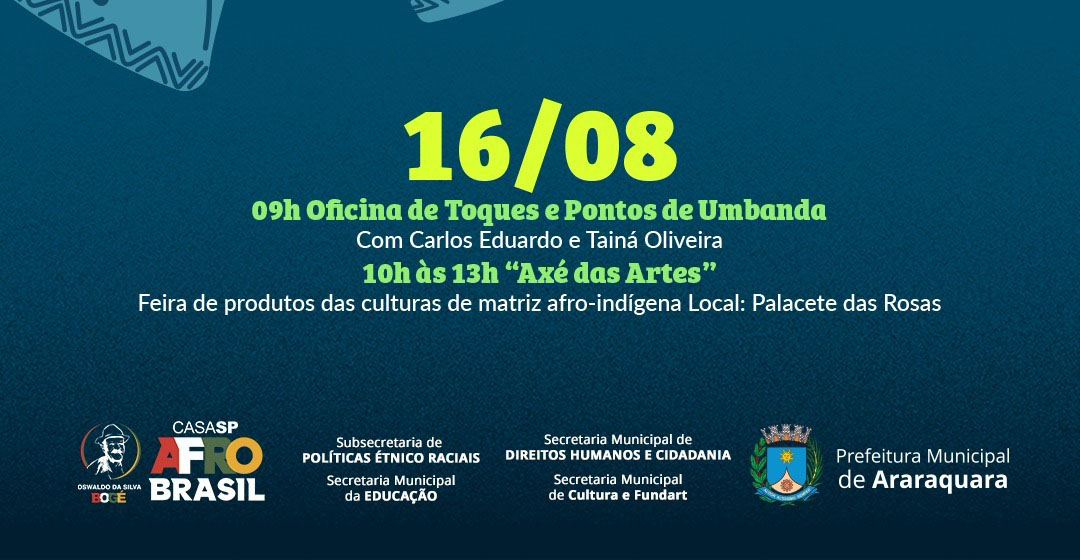 Vale destacar que também no sábado, será realizada, na frente do Palacete, das 10h às 13h, a “Feira Axé das Artes”, voltada para empreendedores, artistas e artesãos que produzem ou comercializam sua arte inspirada ou diretamente relacionada às culturas de matriz africana (no domingo a feira estará na Casa SP Afro, das 10h às 13 horas).