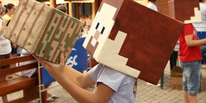 Nesta oficina, inspirada no jogo eletrônico Minecraft, que permite ao jogador criar cenários e objetos utilizando blocos, os participantes constroem a cabeça de um de seus personagens usando caixas de papelão de forma criativa.