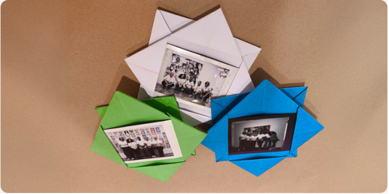 A oficina propõe o registro de um momento especial por meio de uma foto instantânea e a criação de um porta-retrato personalizado, utilizando técnicas de origami.