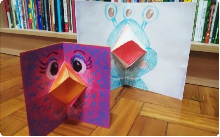 Criação de cartões pop-up com diversas formas de bocas de humanos, animais e até mesmo de seres incríveis a partir da intervenção manual / artesanal e imaginação inventiva das crianças.