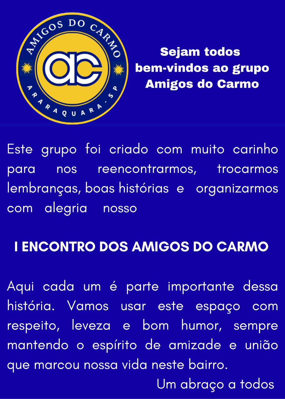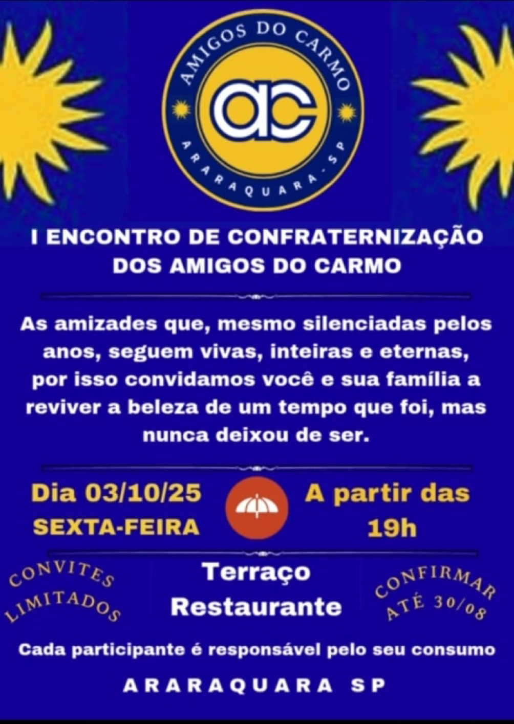 I ENCONTRO DOS AMIGOS DO BAIRRO DO CARMO: já conta com mais de 150 adesões para o jantar do encontro, a ser realizado no dia 03 de outubro de 2025, a partir das 19h no Terraço Restaurante, ficando por conta de cada participante o seu consumo. Ainda tem alguns lugares para participação, pois há limite no Restaurante. Será um belo encontro dos amigos do bairro, com muitas lembranças, a exemplo: a Igreja do Carmo, quermesses, Cine Coral, campos de futebol da Portuguesinha, Paulista, Benfica e outros, Grupo Escolar Florestano Libutti, Ginásio Victor Lacorte, presépio do DER, famosas empresas do bairro etc.