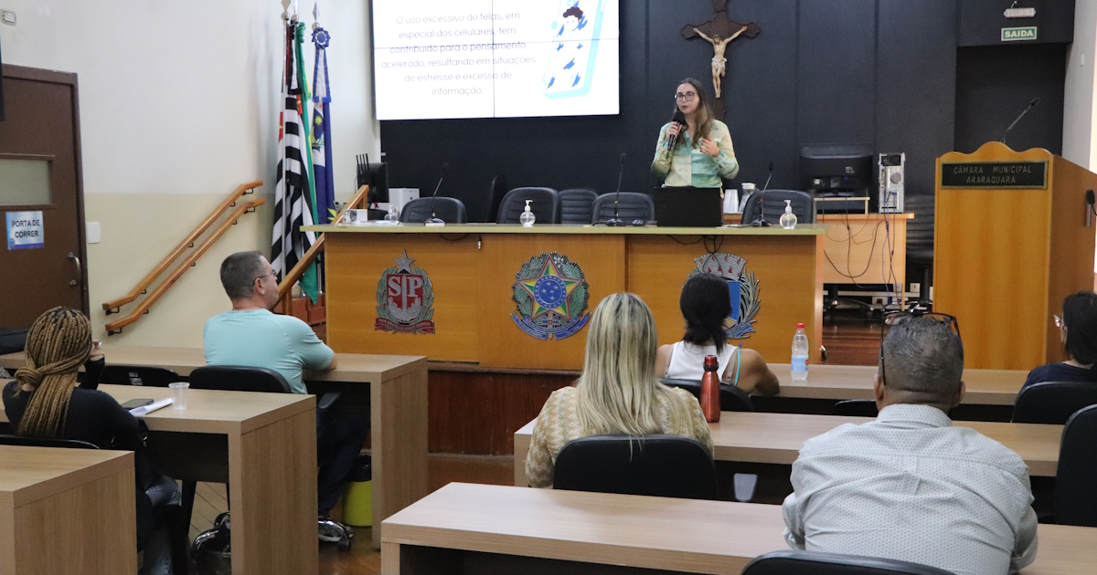 Na tarde da sexta-feira (26), o Plenário da Câmara Municipal de Araraquara recebeu a palestra “Saúde Mental – Como Cuidar da Mente no Mundo Atual”, ministrada pela psicóloga Giovana Benassi Cezar.