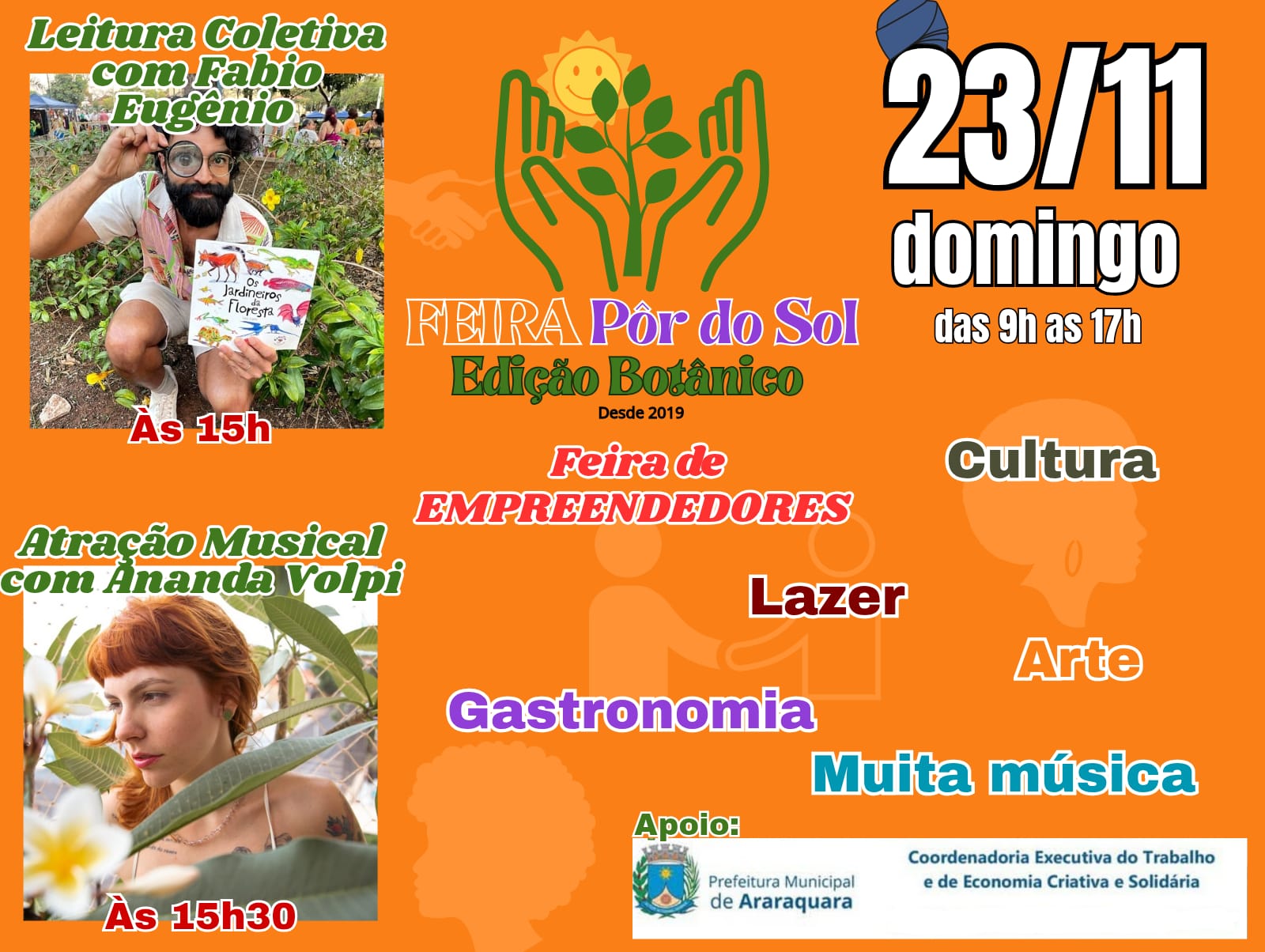 A Feira Pôr do Sol é a atração deste domingo, 23 de novembro, na Praça do Botânico, em Araraquara. A feira acontece das 9h às 17h, com entrada gratuita e diversos expositores de Araraquara e região.