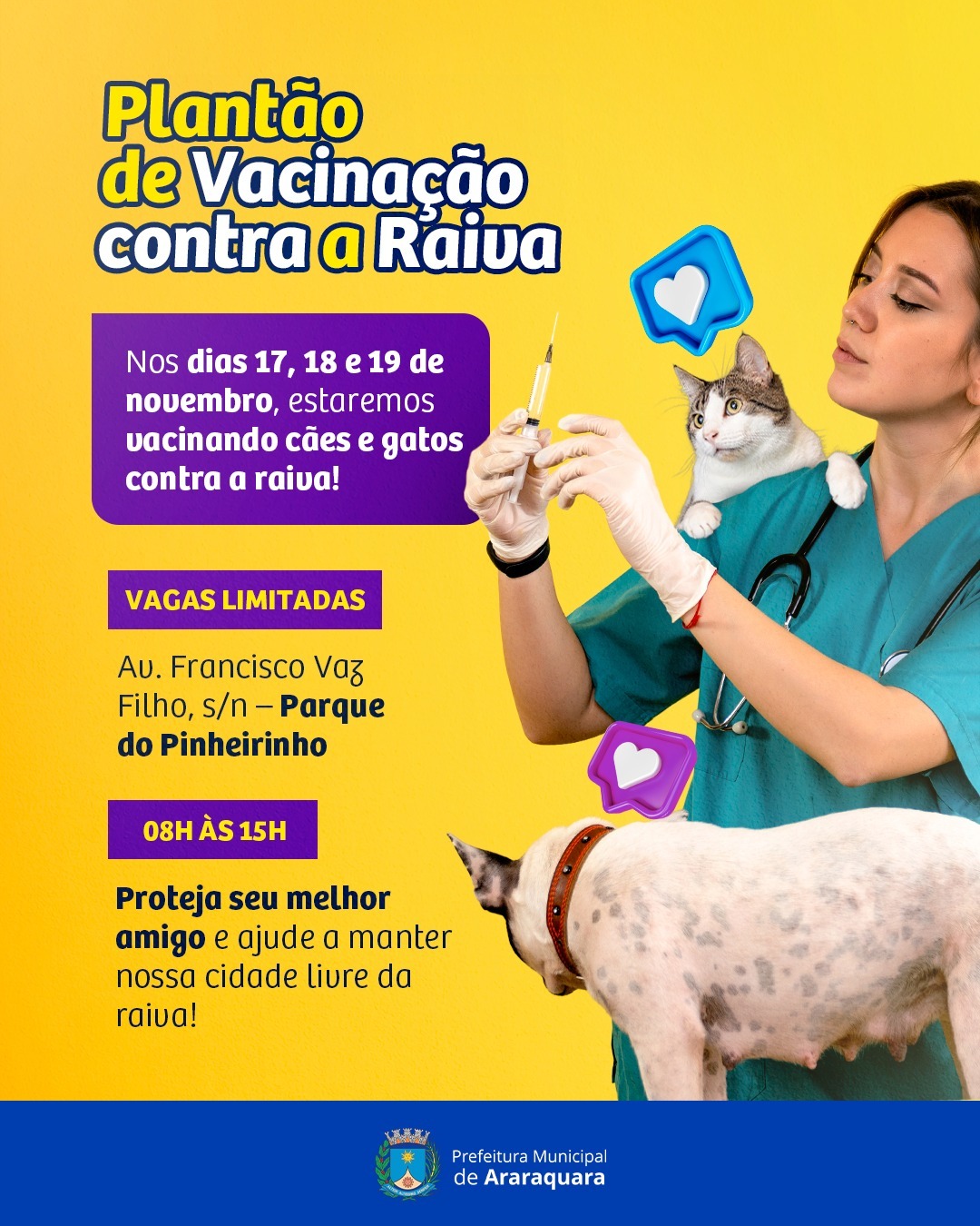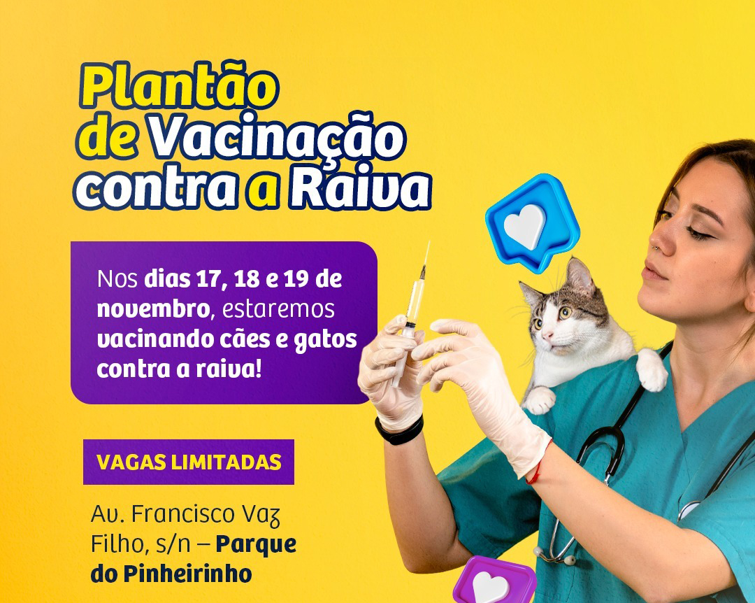 A equipe do Centro de Controle de Zoonoses da Prefeitura atenderá, em esquema de plantão, tutores que precisam vacinar cães e gatos contra raiva nesta segunda, terça e quarta-feira (dias 17, 18 e 19), no Parque Pinheirinho. O atendimento é gratuito e acontece por ordem de chegada, das 8h às 15h. Não há necessidade de agendamento prévio, mas as vagas são limitadas.
